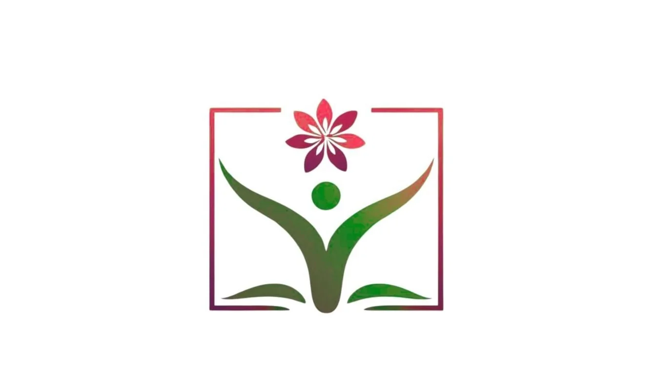 • Abstract logo with a green person-like figure and a red flower above, enclosed in a square frame.